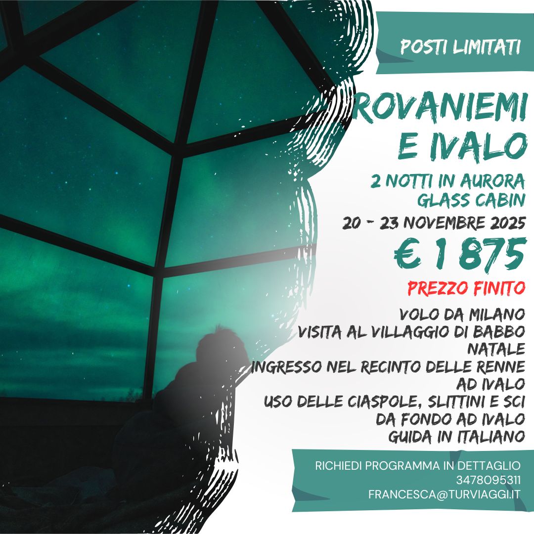 Presentarsi all’aeroporto di Milano Malpensa, disbrigo individuale delle formalità di imbarco e partenza per Rovaniemi con voli di linea Finnair via Helsinki. Arrivo in Lapponia, incontro con la guida Agamatour e trasferimento in albergo per il check in. Cena in hotel. Se le condizioni meteo saranno favorevoli la guida darà indicazione su dove andare a cercare l’aurora boreale a qualche centinaio di metri dall’hotel.