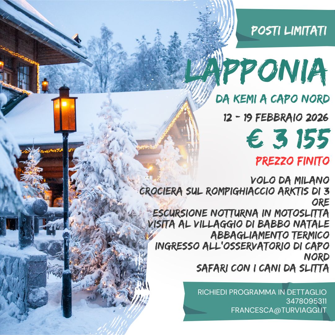 Prima colazione in hotel. Ritirato l’abbigliamento termico ci si dirigerà verso l’allevamento di cani da slitta. La giornata continua in stile “Jack London”. Dopo un breve ma indispensabile briefing in cui verranno spiegate le regole di conduzione, si parte (due partecipanti per slitta) per un safari nella foresta, dove il silenzio è rotto solo dall’abbaiare dei cani. Dopo il safari, rientrati all’allevamento il responsabile dell’allevamento, spiegherà le caratteristiche e le tecniche di addestramento dei cani. Rientro ad Inari e tempo libero per un po’ di shopping o per una visita individuale al vicino ed interessante museo Siida: all’interno si potrà approfondire quello che si è visto nei giorni precedenti: natura e cultura Sami. Cena in hotel ed incontro nella lobby con la guida Agamatour e le guide locali, per ritirare i caschi e raggiungere le motoslitte a pochi passi dall’hotel. Dopo una breve lezione di guida si parte per un safari notturno sul lago ghiacciato. Il percorso sarà illuminato soltanto dai fanali delle motoslitte e con un po’ di fortuna, dai giochi di colori che l’aurora boreale crea in cielo. Proseguimento fino ad un accampamento dove si arrostiranno salsicce al fuoco e saranno offerte bevande calde. Rientro in albergo.8° giorno IVALO – ITALIA