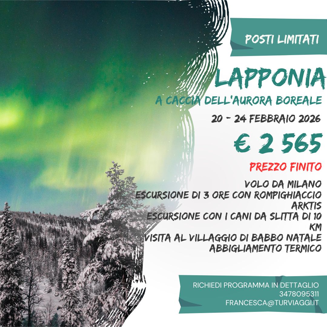 Dopo cena incontro con la guida per ritirare i caschi e recarsi al parcheggio delle motoslitte. Da qui partenza per un safari notturno nella foresta, dove il percorso sarà illuminato soltanto dai fanali delle motoslitte e, con un po’ di fortuna, dai giochi di colori che l’aurora boreale crea in cielo. Arrivati al campo acceso il fuoco, verranno offerte bevande calde. Durante la sosta la guida illustrerà ai partecipanti tutte le informazioni sull’aurora boreale. DURATA: 3 ore PREZZO: adulto € 180,00 bambino (4/14 anni) € 135,0023 febbraio lunedì ROVANIEMI VILLAGGIO di BABBO NATALE e IGLOO DI VETRO